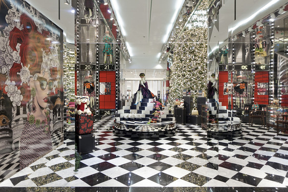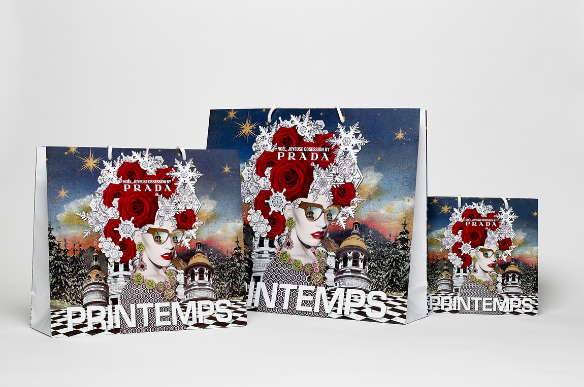 French department store Printemps and luxury Italian fashion house Prada collaborated on a project when Prada redesigned the Paris-based department store with a Christmas theme. A series of visuals were created to marry both brands via recognisable patterns, such as red roses of varying sizes, reminiscent of styles of Prada and the iconic facade of Printemps in the backdrop. The chequered black and white floor pays homage to the first Prada store, which opened in 1913 in an arcade called ‘Galleria Vittorio Emanuele II’ in Milan, Italy.