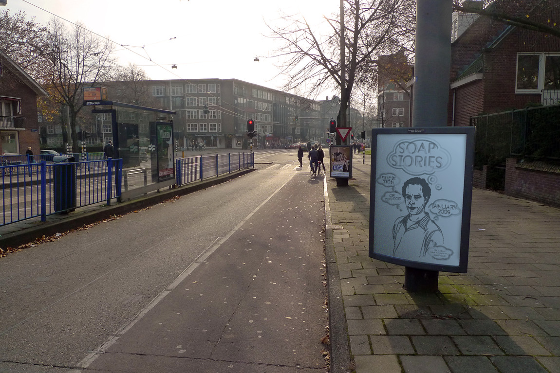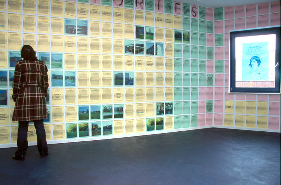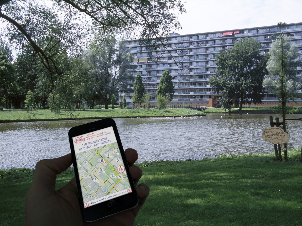 'SoapStories' by Hala Elkoussy presents an overview of fictional interactions and stories based on real people’s conversations within the Bijlmer (Zuid-Oost) Area of Amsterdam. Displayed in soapy colors, the exhibition presents a constellation of people, places & stories and their interactions as a script divided over 1.500 sheets of A4 papers. The app connects the fictional scripts back to real locations.