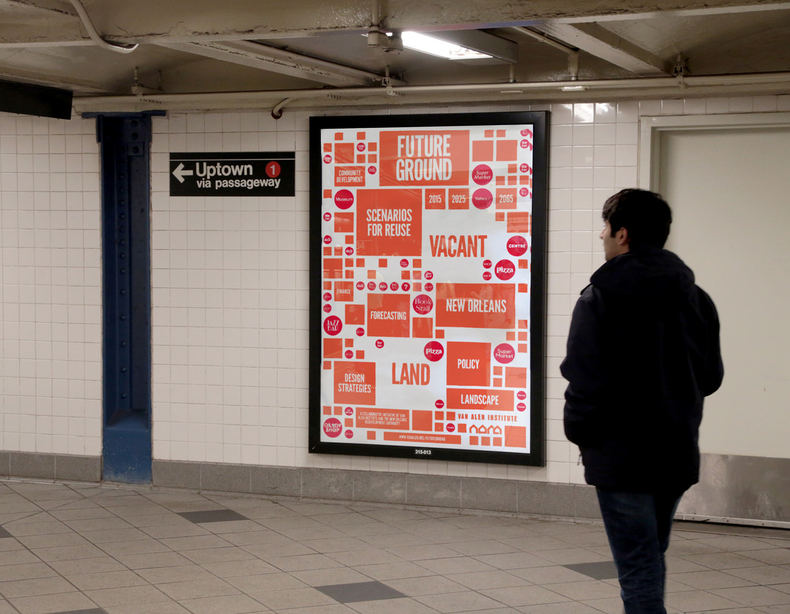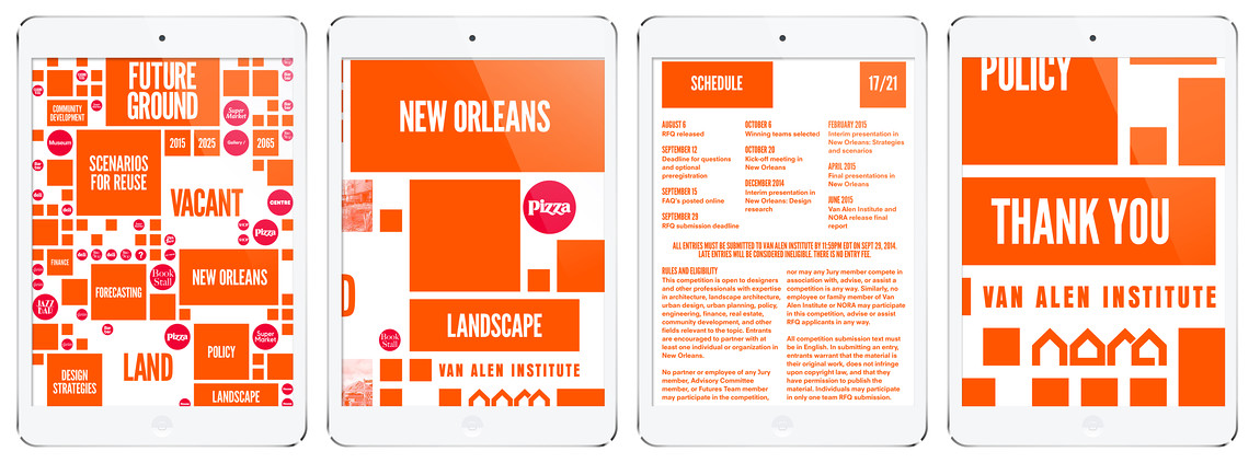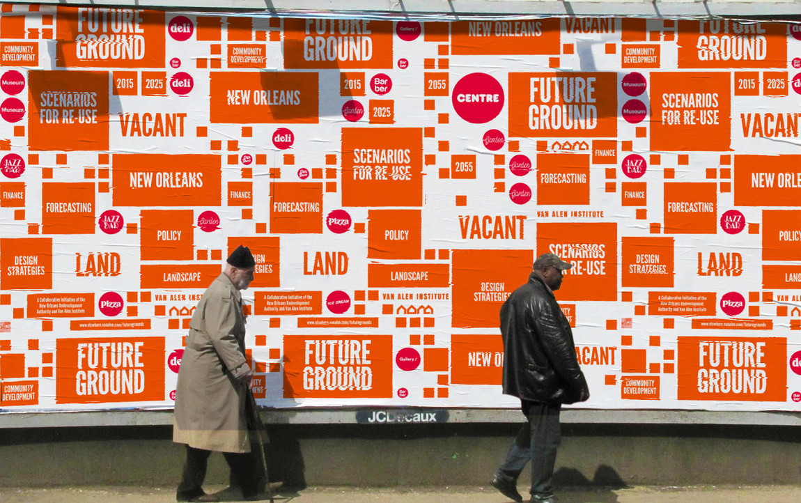 Future Ground is a research competition initiated by the Van Alen Institute (NYC). The competition invites multidisciplinary teams to generate flexible design and policy strategies to reuse vacant land in New Orleans. Goal is to transform abandoned landscapes into resources for the current and future city. The brand combines the idea of ‘vacant lots’ with an activating visual language to engage the local population. Open areas make space for stickers showing potential ideas. Future Ground micro site.